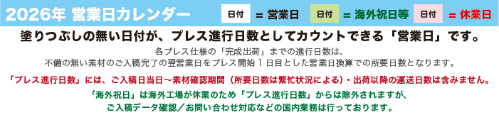 2022年8月11日(木)~8月15日(月)までは、夏期休業によりプレス進行の営業日カウントから除外されますのでご了承ください。